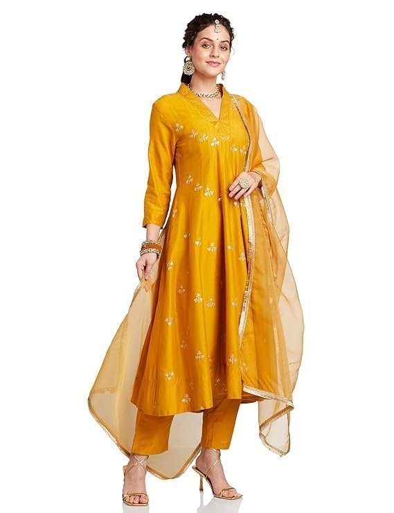 - PRODUCT DETAILS: 3-piece set featuring V-neck kalidar kurta with 3/4th sleeves, all-over zari & sequin embroidery and side pocket, paired with straight fit pyjama and organza dupatta finsihed with lace edge.