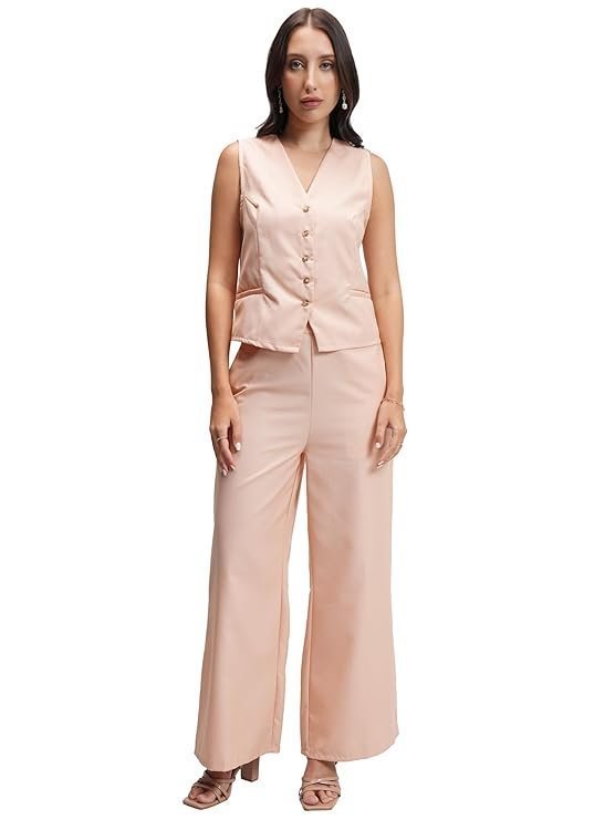 - 📝🛍️ Product Description: This chic co-ord set features a structured waistcoat paired with high-waisted flared trousers, creating a sleek and elegant silhouette. Designed for a polished yet trendy look, this ensemble effortlessly blends sophistication with modern style