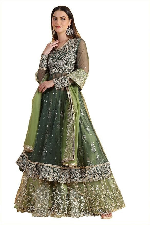 • This Leaf Green Fusion 5-Skirt Set Features A Stunning Anarkali Silhouette With Metallic Embroidery And Mesh Detailing. The Full-Sleeved V-Neck Design Offers A Comfortable Fit, Perfect For Special Occasions. Its Mid-Calf Length Adds Elegance To Your Wardrobe.